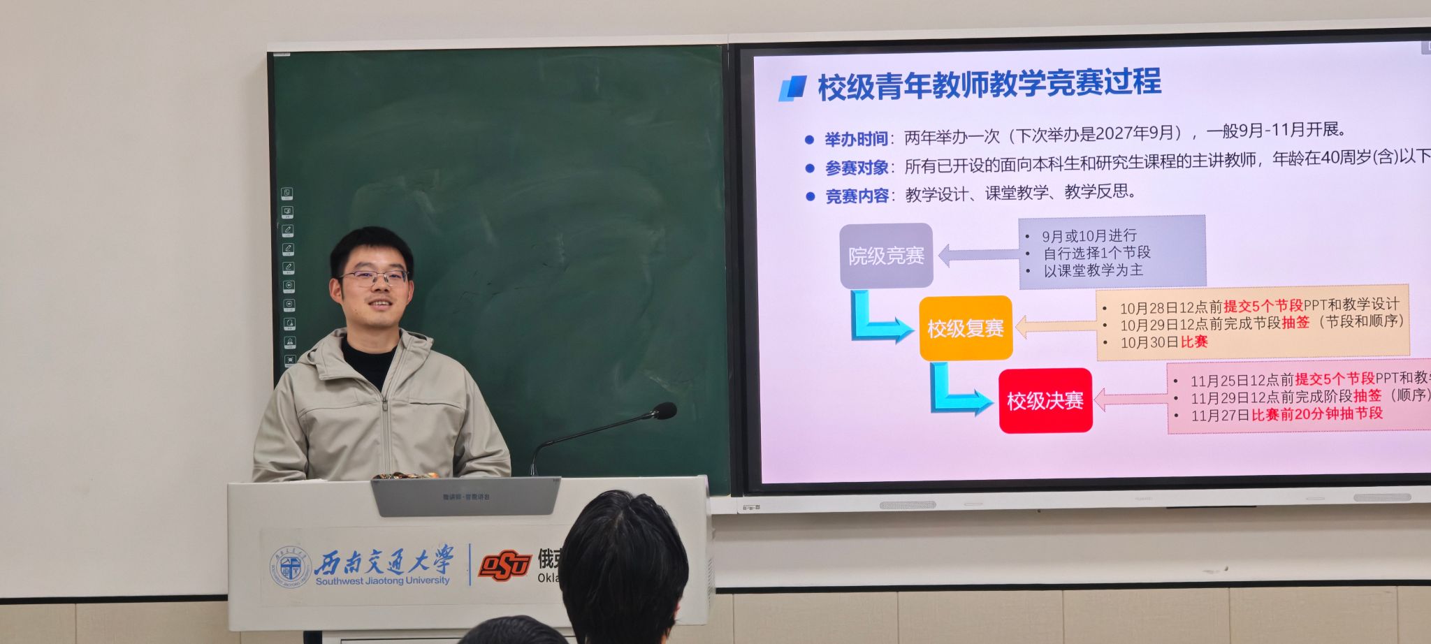 他详细介绍了校级青年教师教学竞赛的相关规则——竞赛每两年举办一次,面向40周岁及以下的本科生、研究生课程主讲教师,涵盖教学设计、课堂教学、教学反思三个核心环节,需提前提交多个节段的PPT和教学设计方案,并通过抽签确定比赛顺序与内容。结合自身备赛经历,曾卓分享了“要素完整、兼顾易懂性与专业性”的教学设计技巧,他谈到,专业性强的课程需注重内容组织以避免枯燥,通识类课程则要挖掘特色亮点实现突破,而多轮备赛过程既是压力也是动力,能有效促进教学内容的打磨与优化。