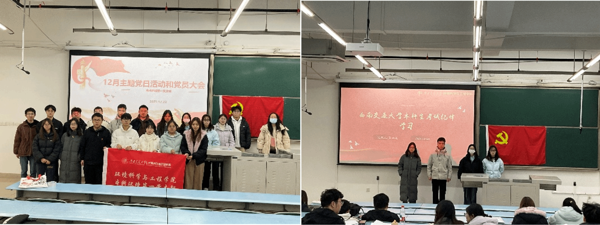 2025年12月22日下午,西南交通大学环境科学与工程学院本科环境第一党支部于犀浦校区X2218教室,围绕“学习宣传贯彻党的二十届四中全会精神”与“强化期末学风建设”两大主题,组织开展十二月主题党日活动。活动旨在引导支部党员深刻把握国家发展大政方针,同时筑牢诚信应考的思想防线、严守纪律底线,切实发挥学生党员在思想引领与学风建设中的表率作用。