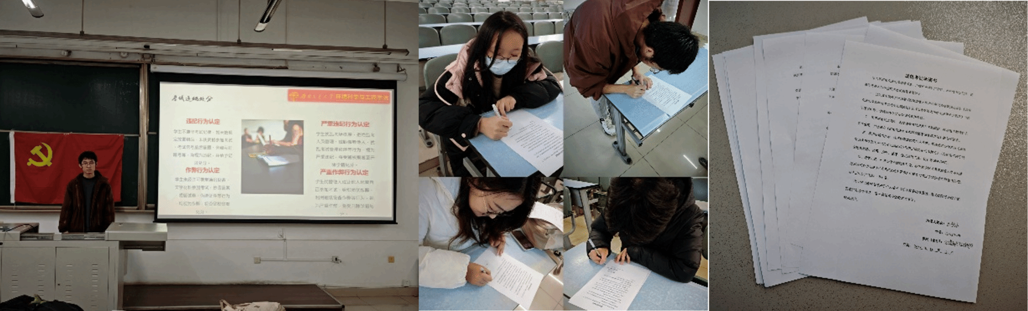 随后,活动进入学风建设专题环节,集中开展了考试纪律学习教育。全体党员认真学习了《西南交通大学本科生考试违规处理办法》《西南交通大学本科考试考场管理办法》等规章制度。通过典型案例剖析和纪律知识解读,明确违纪作弊行为的严重性和后果,进一步强化了诚信应考的规则意识与底线思维。会上,支部党员共同签署了《诚信考试承诺书》,并承诺将以身作则,带头维护公平、公正的考试环境,积极影响和带动身边同学共同践行诚信承诺,营造风清气正的期末备考氛围。