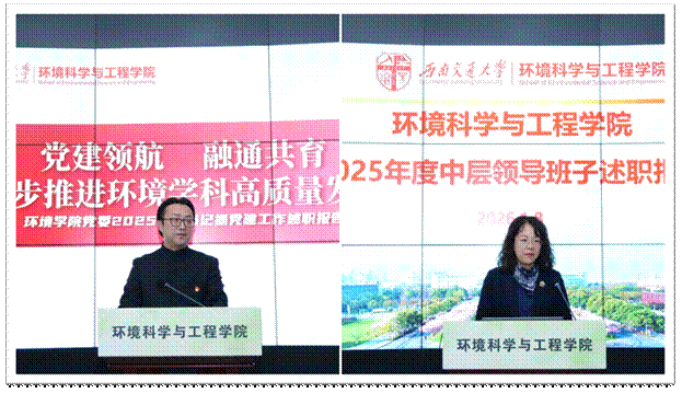 为全面总结年度工作成效,压实管党治党政治责任,凝聚推动学院高质量发展的强大合力,1月8日下午,环境科学与工程学院在犀浦校区X4243报告厅召开2025年度党建工作述职评议暨干部考核大会。学校党委组织部督导员张湘蓉同志莅临指导。学院全体教职工、学生党支部书记代表及相关测评人员参加会议。大会由学院党委书记甘霖主持。
