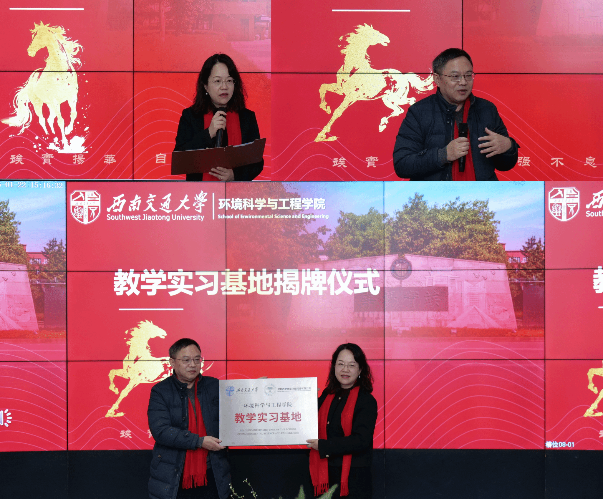 环境学院院长龚正君教授发表新年贺辞,她回顾了学院过去一年在教学、科研、人才培养等方面取得的丰硕成果,感谢西交扬华公司长期以来的深度合作与大力支持,并对未来双方进一步深化产教融合、实现共赢发展寄予殷切期望。西交扬华公司董事长付永胜教授致辞,他高度肯定了校企合作以来取得的显著成效,强调将继续秉持“产教融合,互惠共赢”理念,与环境学院携手并肩,在环保科技领域共创佳绩。龚正君院长为西交扬华公司授牌,正式确立其为学院教学实践基地,标志着双方合作迈入新阶段。