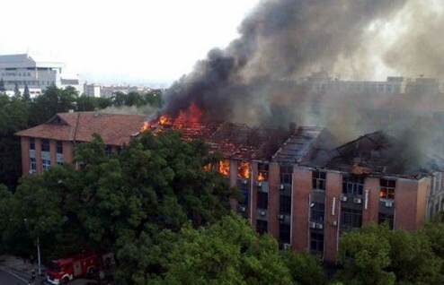 2011年10月10日中午12时59分,长沙某大学化工学院实验楼四楼发生火灾。此次火灾过火面积约500平方米,所幸无人员伤亡。但许多宝贵的资料被烧毁,十余年的科研数据付之一炬,给学校的教学、科研工作带来了无法弥补的损失。这栋四层的楼房建于1960年,由于楼房屋顶为纯木质结构,加上四楼实验室有很多有机易燃试剂,火势蔓延十分迅速,顶层基本被烧毁,殃及几个重点实验室。