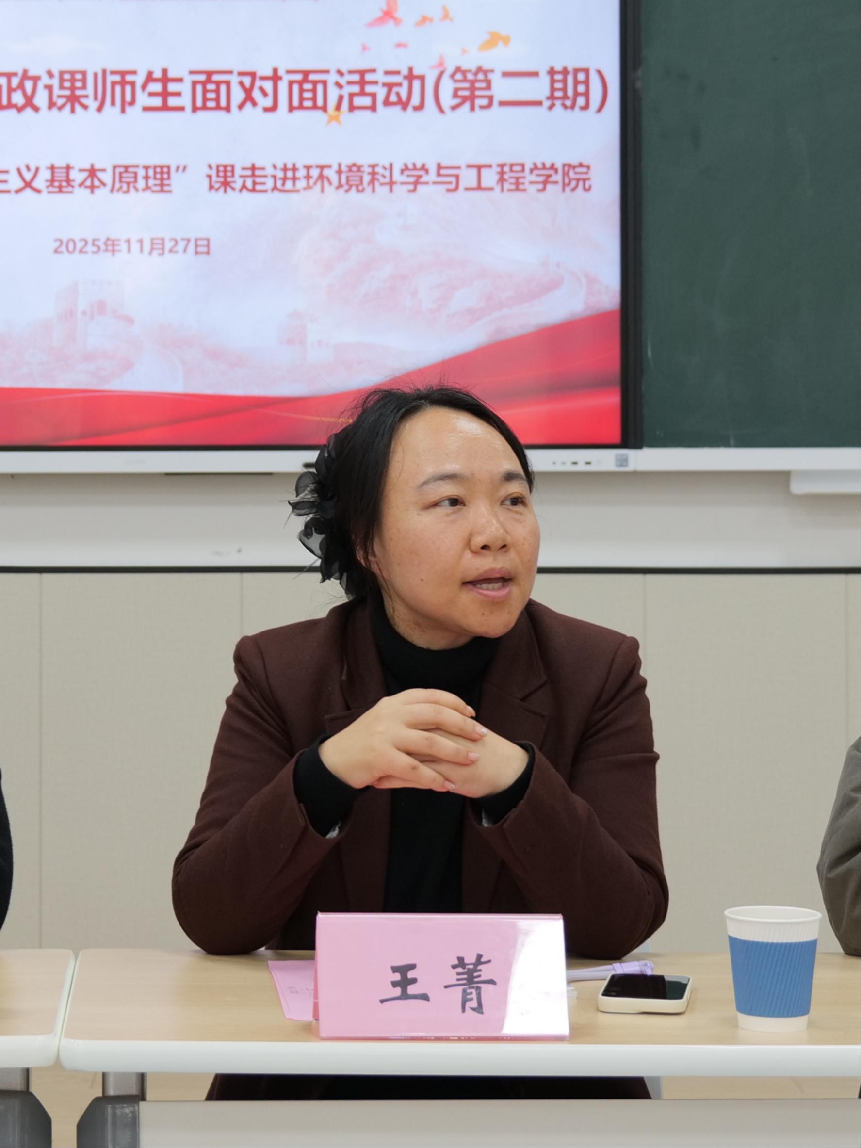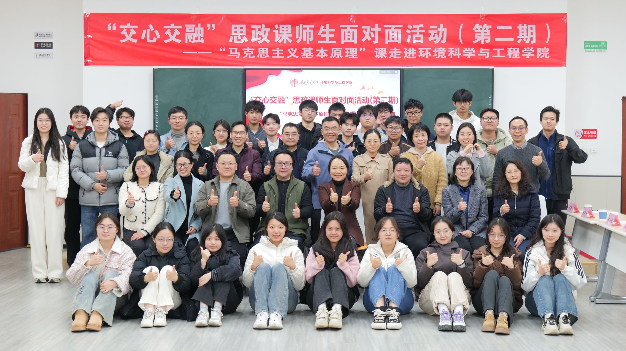 11月27日下午,马克思主义学院联合环境科学与工程学院,成功举办第二期“交心交融”思政课师生面对面活动。双方师生共聚一堂,将马克思主义基本原理课堂从“讲台”延伸至“面对面”,展开了一场有温度、有深度的思想对话。环境科学与工程学院党委书记甘霖、马克思主义学院副院长王菁、马克思主义基本原理教研室颜军教授、罗敏副教授等全体教师,以及环境学院辅导员翟琦、赵瑞涵、黄泳桦与2023级、2024级30名学生代表共同参与。活动由马克思主义基本原理教研室党支部副书记甄学涛主持。