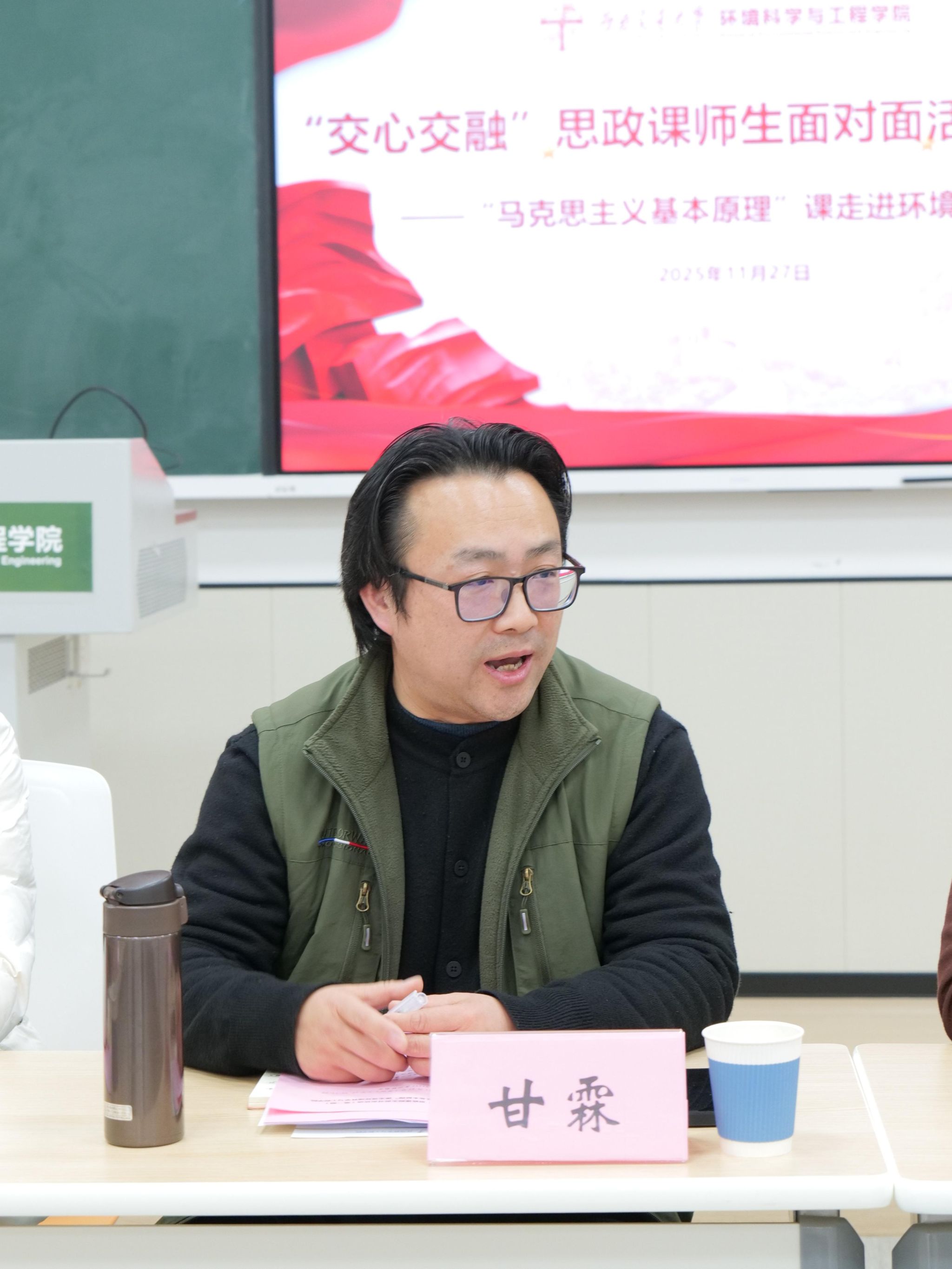 活动最后,环境科学与工程学院党委书记甘霖作总结讲话。他高度肯定了本次活动取得的成效,指出师生在交流中凝聚的“专业+思政”融合共识,正是“交心交融”活动的核心价值所在——让理论不再“高高在上”,而是落地生根;让专业成长紧扣时代脉搏,锚定美丽中国建设的使命坐标,也期待学院与马克思主义学院紧密携手,共同推动思政教学创新与育人成效再上新台阶。
