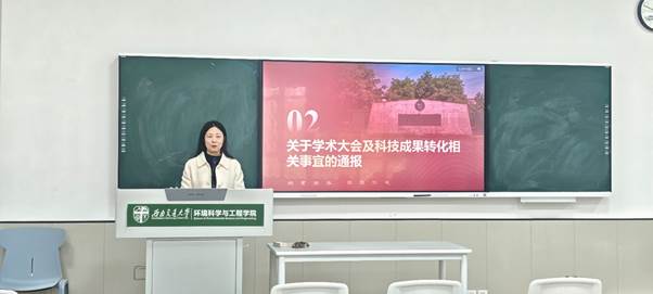 随后,张涵副院长通报了学院近期重点工作进展。她代表学院对全体教师在我院承办的“2025新时代高校环境教学改革与创新交流会”筹备与举办过程中的辛勤付出表示感谢。此次大会汇聚了全国200余所高校的700余位专家学者参与,不仅大幅提升了学院在环境教育领域的影响力,也为学院高质量发展注入了强大动能。随后,张涵副院长详细解读了学校最新发布的《科技成果转化收益分配管理办法(试行)》,强调学院将通过政策支持、资源整合等方式,鼓励教师加速科研成果落地转化,服务国家“双碳”目标需求。