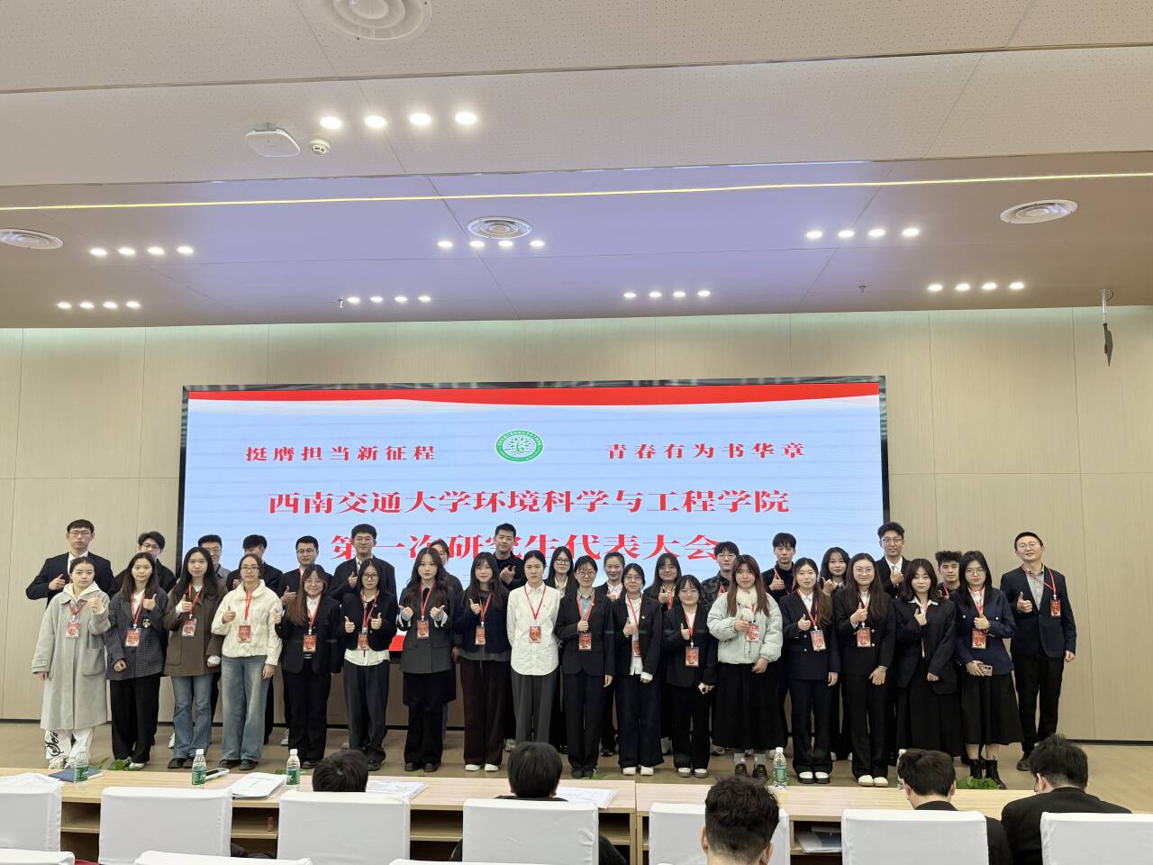 西南交通大学环境科学与工程学院第一次学生代表大会、第一次研究生代表大会的召开是学院学生政治生活中的一件大事。全院学生组织和广大青年学生将以本次学研代会为新的契机,在学院党委的领导和团委的指导下,牢记全心全意为同学服务的宗旨,团结带领全院同学坚定理想信念、练就过硬本领、勇于创新创造、矢志艰苦奋斗,在实现中华民族伟大复兴的生动实践中书写无愧于时代的青春华章。