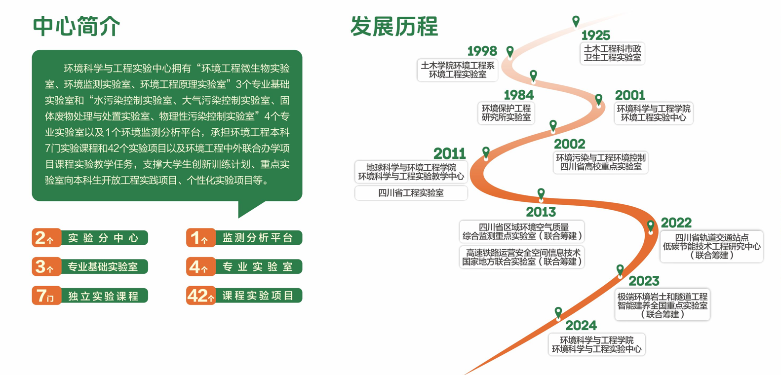 环境科学与工程实验中心(环境保护工程研究所实验室)成立于20世纪80年代,1998年土木工程学院设立环境工程系后,设立环境工程实验室;2001年成立环境科学与工程学院,设立环境科学与工程学院环境工程实验中心,2002年被批准为环境污染与工程环境控制四川省高校重点实验室;2010年11月,该学院与测绘学科、地质学科整合,组建地球科学与环境工程学院,与测绘科学与技术实验中心、地质资源与地质工程实验中心、消防工程实验中心合并成立高速铁路地球科学与环境工程实验教学中心,并于2022年获批四川省省级实验教学示范中心;2023年因学科调整,环境科学与工程学院成立,2024年获批轨道交通智慧环保与可持续发展国际科技合作基地、轨道交通工程污染防治四川省工程研究中心。